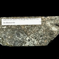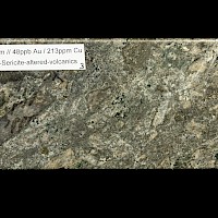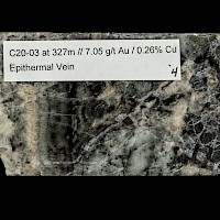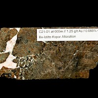 In the calc-alkaline porphyry system seen in holes C12-03, C13-03, C19-03 and C20-03, C21-01 and C21-02 alteration and mineralization consists respectively of intense sericite-carbonate-pottassium feldspar alteration with gold-copper associated with fine grained pyrite chalcopyrite sulphides. The calc-alkaline mineralization is associated with a North South striking low resistivity trend coincident with a magnetic low measuring 600 m x 1300m.Two mineralized intrusives have been identified: 1) hypabyssal monzonite associated with the magnetic low with intense sericite-potassium feldspar alteration and 20% disseminated sulphides intersected in hole C19-03 and the inclusion in C13-03 and 2) a feldspar-biotite porphyry on the eastern flank of the magnetic low intersected in C20-03 with strong sericite alteration and potassium feldspar overprint with 2-5 % disseminated sulphides.