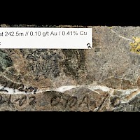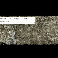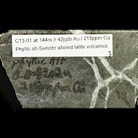 The intersection of a high grade copper-gold calc-alkaline monzonite inclusion in hole C13-03 shifted the focus of exploration toward an area around hole C13-03 and resulted in the discovery of the gold-copper bearing porphyry in drill holes C19-03, C20-03, C20-01, C21-02 which is coincident with a large, 600m by 1300m magnetic low.
