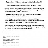 Combined holes C20-03, C21-01, and C21-02 outlined a tabular, sericite altered envelop 500 metres thick along a strike length of 800 metres and a width in excess of 1000 metres (500m x 800m x1000m). This represents a large volume of intensely hydrothermally altered latite/monzonite volcanic rocks with thick zones of potassic alteration containing gold-copper mineralization: two 82-85 metre long intercepts in the north (“Cross Section A”); and a 90 metre long intercept in the south (“Cross Section B”). This environment indicates the presence of a large gold-copper porphyry system with the lower intersection in drill hole C21-02 indicating the potential for higher grads.